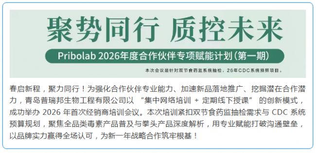 作為國家級高新技術(shù)企業(yè)、青島市 “專精特新” 企業(yè),普瑞邦深耕食品安全檢測領(lǐng)域多年,擁有生物毒素創(chuàng)新技術(shù)專家工作站、多項(xiàng)體系認(rèn)證及 42 項(xiàng)知識產(chǎn)權(quán)成果,產(chǎn)品覆蓋標(biāo)準(zhǔn)物質(zhì)、快檢產(chǎn)品、智能儀器等全鏈條,與全國多家科研院所、檢測機(jī)構(gòu)、知名企業(yè)建立長期合作。