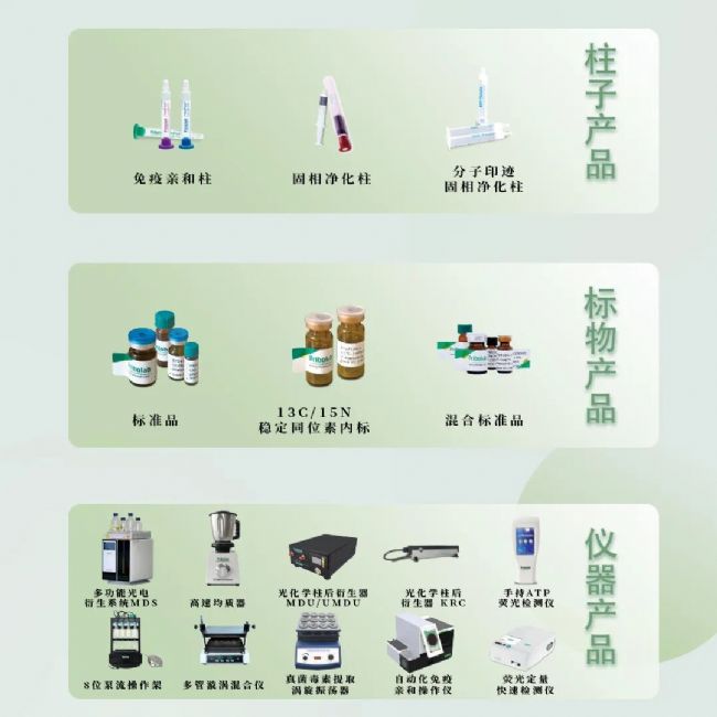 “柱子” 系列:免疫親和柱憑借抗原抗體特異性結(jié)合技術(shù),實(shí)現(xiàn)多類毒素精準(zhǔn)凈化,適配糧谷、中藥等復(fù)雜樣品;多功能固相凈化柱 30 秒一步凈化,回收率超 90%,常溫可存 30 個月,操作便捷性與穩(wěn)定性雙在線,完美匹配快速檢測場景。