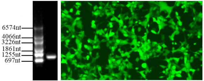 eGFP mRNA 瓊脂糖電泳以及轉(zhuǎn)染HEK293 細(xì)胞24h后表達(dá)效果