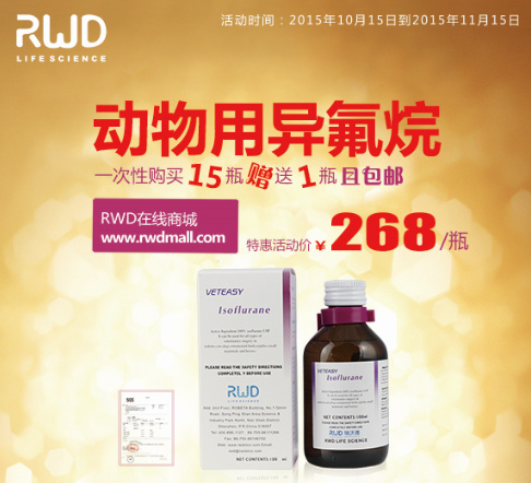 在2015年10月15日到2015年11月15日期間,動(dòng)物用異氟烷特價(jià)銷(xiāo)售,每瓶?jī)H售268元,一次性購(gòu)買(mǎi)15瓶送1瓶且包郵。