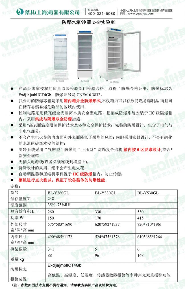 葉其(上海)電器有限公司近期推出新品溫度顯示防爆冷藏試劑柜,采用箱內(nèi)外全防爆形式,集成與隔離雙全防爆措施,箱內(nèi)按0區(qū)要求設(shè)計(jì),符合*新安全規(guī)范,具體參數(shù)如下: