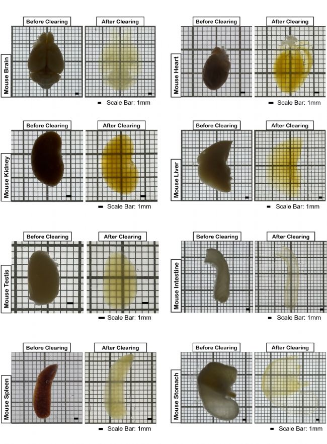 锘海新研發(fā)的透明化試劑盒是基于各種透明化方法測(cè)試和比較后,以及依托測(cè)樣服務(wù)中積累到的豐富而寶貴的經(jīng)驗(yàn),經(jīng)過精心優(yōu)化的配方,可以穿透細(xì)胞而不損傷自身及蛋白質(zhì)結(jié)構(gòu),高效地進(jìn)行脫色脫脂,采用親水性溫和環(huán)境的設(shè)計(jì),使其在組織熒光保護(hù)、樣本形態(tài)維持、降低自發(fā)熒光等方面表現(xiàn)出非常優(yōu)異的性能,輕松實(shí)現(xiàn)小鼠腦、心、肝、脾、肺、腎、胃、腸、睪丸、淋巴、胎盤、卵巢等各類組織器官的透明化,適用范圍廣、操作簡便、速度快、效率高,是廣大科研工作者的較佳選擇。