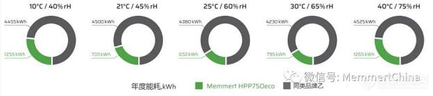 以25℃±2℃/60%rH±5%rH這個(gè)操作點(diǎn)來(lái)說(shuō),這是長(zhǎng)期穩(wěn)定性考察中最常見(jiàn)操作點(diǎn),也是生產(chǎn)后持續(xù)穩(wěn)定性考察常用的參數(shù)(另外一個(gè)參數(shù)為20℃±2℃),Memmert HPP750eco的能耗僅為652kWh/年同類壓縮機(jī)制冷穩(wěn)定性試驗(yàn)箱品牌系列中節(jié)能型號(hào)的1/7。其余操作點(diǎn)的能耗數(shù)據(jù)對(duì)比可以看出,最小的差距也是相差72%(HPP750eco耗電量是同類產(chǎn)品的28%)。