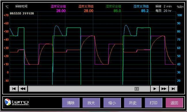 - 國家發(fā)明專利(201210145259.6)的制冷量控制裝置,溫度波動(dòng)度 ±0.2 °C,濕度波動(dòng)度± 3 %RH,實(shí)時(shí)顯示溫度和相對(duì)濕度變化的曲線