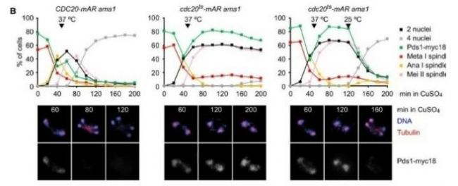 圖B:表達野生型CDC20(CDC20-mAR ama1)和溫敏型cdc20-3(cdc20ts-mAR ama1)的酵母。t = 50 min時,溫度升至37°C,溫敏型菌株被阻斷在減數(shù)分裂中期II;t = 120 min時,溫度降為25℃,溫敏型菌株進入后期II。上圖,通過固定細胞的免疫熒光顯微定量細胞特征(每個時間點n = 100);下圖,減數(shù)分裂II期細胞中DNA,紡錘體和Pds1-myc18的染色。