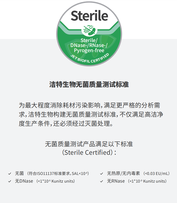 為確保低吸附微量離心管產(chǎn)品品質(zhì),該系列產(chǎn)品均嚴格遵循PCR潔凈測試標(biāo)準和無菌質(zhì)量測試標(biāo)準。