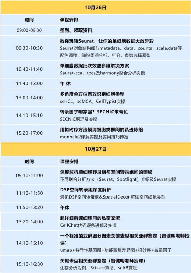 培訓(xùn)班由上海生物芯片有限公司(生物芯片上海國家工程研究中心)與生信技能樹強強聯(lián)手,特邀單細胞及空間分析領(lǐng)域資深老師、生信技能樹創(chuàng)始人曾健明,與SBC專業(yè)生信分析團隊共同開設(shè)多維度課程,關(guān)鍵點逐個擊破。