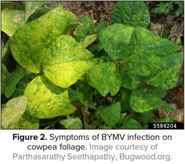 BYMV感染的癥狀因宿主、病毒株、環(huán)境條件和感染時宿主所處的生長階段而異。此外,宿主的品種及其抗性基因的存在對癥狀的發(fā)展和嚴(yán)重程度也有很大的影響。易感豆科植物的典型癥狀包括葉片畸形和肥大、褪綠病變和全身花葉和斑駁(圖2)。幼小的植物會發(fā)育不良,最頂層的葉子會壞死,豆莢會畸形和斑駁。