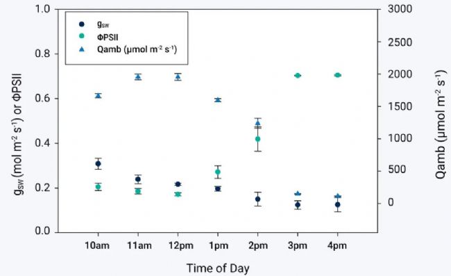圖2. 使用LI-600N,在晴天測得的Pinus mugo針葉的氣孔導(dǎo)度(gsw)和PSII的量子產(chǎn)率(PhiPS2),n=3。