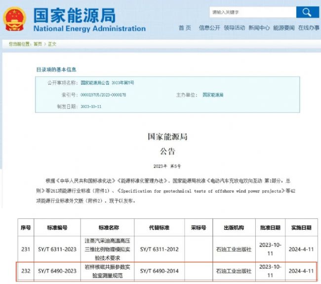 國(guó)家能源局于2023年10月11日發(fā)布《中華人民共和國(guó)石油天然氣行業(yè)標(biāo)準(zhǔn)》,從2024年4月11日起施行。其中《巖樣核磁共振參數(shù)實(shí)驗(yàn)室測(cè)量規(guī)范》明確規(guī)定了,實(shí)驗(yàn)室測(cè)量巖樣核磁共振參數(shù)的主要測(cè)量?jī)x器、主要試劑制備、巖樣制備、巖樣測(cè)量、結(jié)果處理和允許不確定度的要求。適用于巖樣或巖屑核磁共振參數(shù)的測(cè)量。