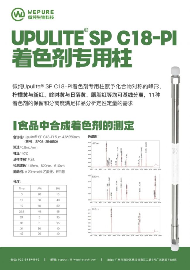 合成著色劑是人工合成的使食品著色和改善食品色澤的物質(zhì),具有顏色鮮艷、性質(zhì)穩(wěn)定、成本低等特點(diǎn),在現(xiàn)代食品工業(yè)中使用廣泛使用。合成著色劑的檢測標(biāo)準(zhǔn)GB 5009.35-2023于2024年三月正式實(shí)施,應(yīng)對新標(biāo)準(zhǔn)的改變,近期,微純推出了合成著色劑的專用柱,用于分析新國標(biāo)中的11種合成著色劑。