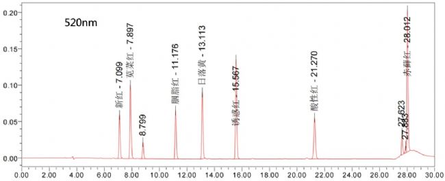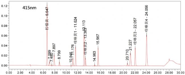 Upulite® SP C18-PI著色劑專用柱賦予化合物對稱的峰形,檸檬黃與新紅、喹寧黃與日落黃、胭脂紅等均可基線分離,11種著色劑的保留和分離度滿足樣品分析定性定量的需求。