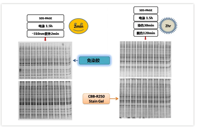 ❸ 高效靈敏:免染膠的靈敏度與考馬斯亮藍染液染色效果相同