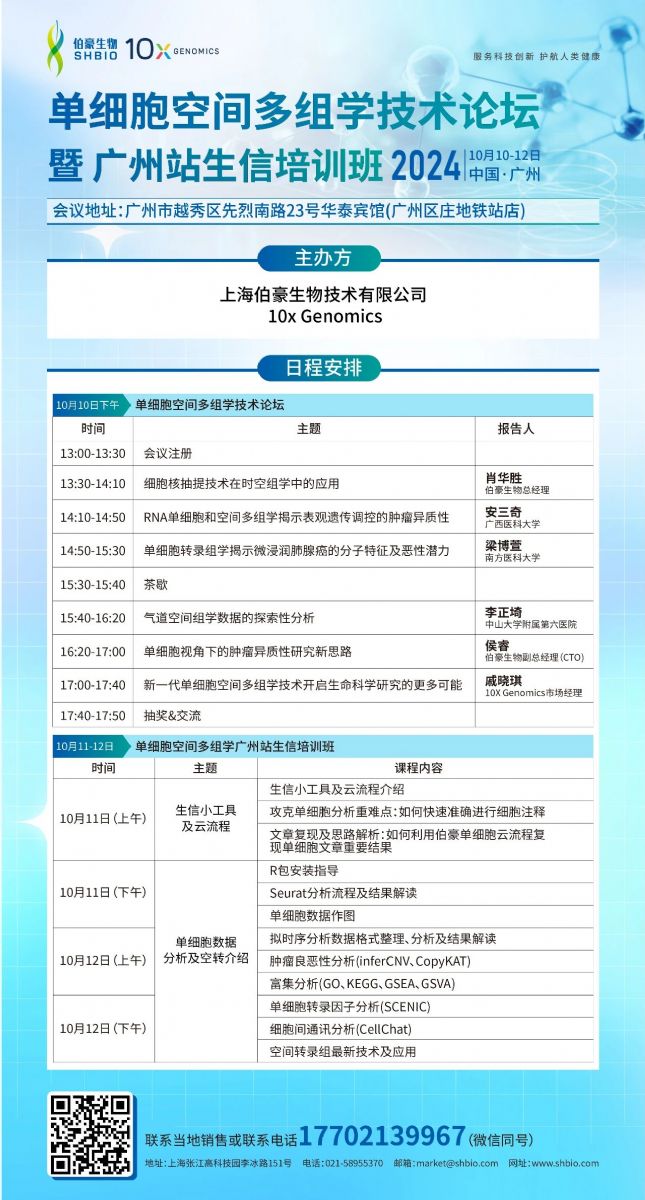 隨著生命科學的飛速發(fā)展,單細胞空間多組學技術(shù)已成為研究細胞功能、疾病機制及生物過程的重要工具。這一技術(shù)不僅極大地提高了我們對復雜生物系統(tǒng)的理解,還為疾病的精準診斷和治療開辟了新的道路。然而,技術(shù)的快速發(fā)展也帶來了數(shù)據(jù)分析和解讀的挑戰(zhàn)。為了促進學術(shù)交流,提升科研人員在生信分析實操中的技能,伯豪生物聯(lián)合10x Genomics特此舉辦“單細胞空間多組學技術(shù)論壇暨廣州站生信培訓班”。