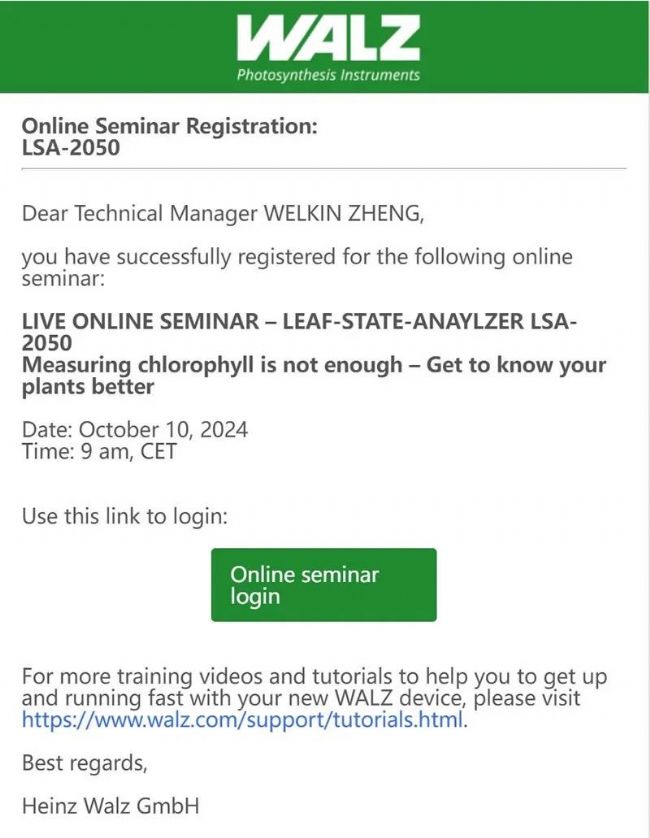 打開德國WALZ公司官網(wǎng)(www.walz.com)即可看到注冊(cè)入口,點(diǎn)擊Sign up,可直達(dá)注冊(cè)頁面,選擇參與的場(chǎng)次時(shí)間,填寫信息,點(diǎn)擊Sign up注冊(cè),之后不久就會(huì)收到回執(zhí)郵件。郵件包含參會(huì)鏈接,開會(huì)當(dāng)天,點(diǎn)擊Online seminar login即可參會(huì)。