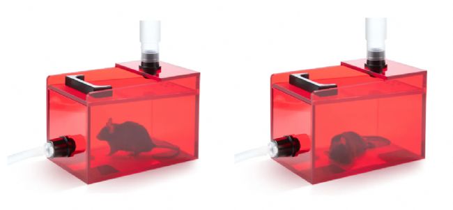 誘導(dǎo)盒創(chuàng)新性使用了高級(jí)紅色透明PMMA板材作為盒體。研究發(fā)現(xiàn)鼠的視錐細(xì)胞只有兩種視蛋白,缺乏感知紅光的視錐細(xì)胞,會(huì)將紅色看成黑色[1]。而且鼠的生物節(jié)律與人相反,研究者做實(shí)驗(yàn)的白天,剛好是嚙齒類動(dòng)物需要休息的時(shí)間,黑色環(huán)境會(huì)讓動(dòng)物感到更加安全,有效降低它們的應(yīng)激反應(yīng)[2]。