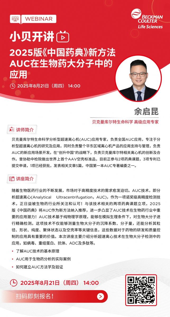 隨著生物醫(yī)藥行業(yè)的不斷發(fā)展,市場對于高精度技術(shù)的需求愈發(fā)迫切。AUC技術(shù),即分析超速離心 (Analytical Ultracentrifugation,AUC) ,作為一項諾獎級高精度檢測技術(shù),正日益被生物藥行業(yè)所關(guān)注和認(rèn)可!與該技術(shù)相關(guān)的兩項藥典課題立項,2025版《中國藥典》將AUC作為新方法納入推薦,進(jìn)一步凸顯了AUC技術(shù)在生物藥行業(yè)中重要的應(yīng)用潛力!AUC技術(shù)基于純物理學(xué)原理,能夠在模擬生理條件下,對生物大分子進(jìn)行精確檢測。這項技術(shù)不僅能夠測量生物大分子的沉降系數(shù)、分子量,還能分析其粒徑、形狀、純度、聚體狀態(tài)以及空殼率等關(guān)鍵信息,這些數(shù)據(jù)對于藥物的研發(fā)和質(zhì)量控制的應(yīng)用具有重要的價值。本次講座主要介紹分析超速離心技術(shù)在生物大分子檢測中的應(yīng)用,如病毒、重組蛋白、抗體、ADC及多肽等。