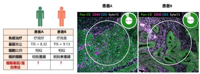 DSP空間組學(xué)測序助力闡述機(jī)制:同類型細(xì)胞(如CD45+免疫細(xì)胞)在響應(yīng)不同(A療效好;B療效差)的樣本中轉(zhuǎn)錄組和蛋白組有什么差異。