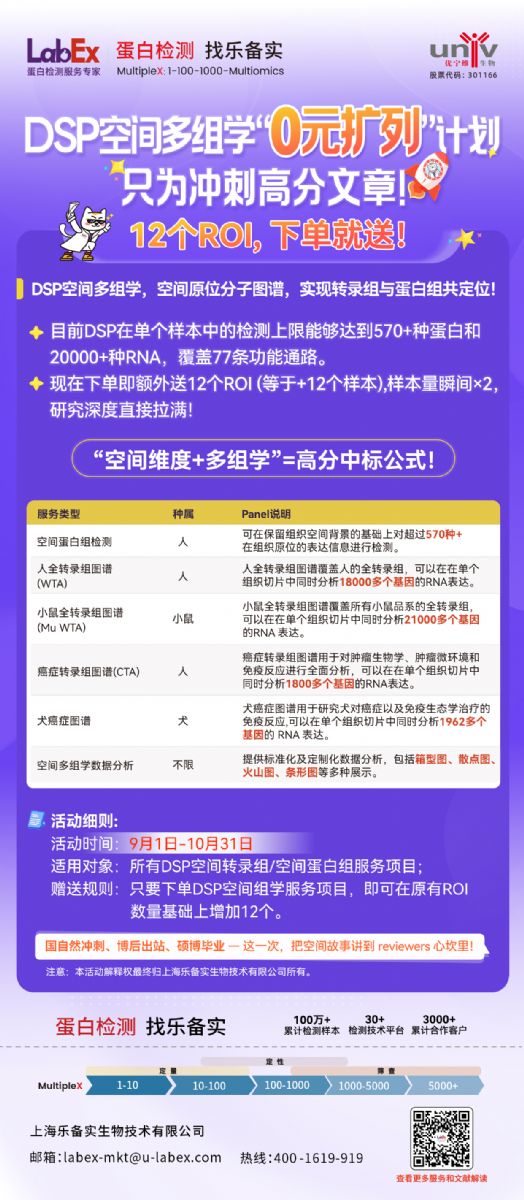 如果老師您的課題需要用到組織原位的空間組學(xué)測序,作為優(yōu)寧維生物子公司樂備實(shí)Labex服務(wù)的限時(shí)促銷,您千萬不要錯(cuò)過!祝福您的課題順利!研究順利!