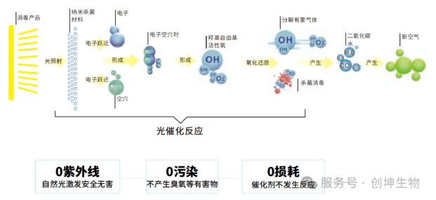 全光譜高效光催化技術(shù):選用納米光催化材料“同心鈦”,在可見光照射下觸發(fā)納米殺菌因子(羥基自由基和活性氧),