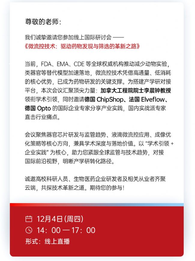 技術(shù)趨勢與監(jiān)管導(dǎo)向同頻共振,亟需搭建連接國際前沿與國內(nèi)實(shí)踐的產(chǎn)學(xué)研對接平臺。12月4日,《微流控技術(shù):驅(qū)動藥物發(fā)現(xiàn)與篩選的革新之路》線上國際研討會即將啟幕,我們以“賦能行業(yè)創(chuàng)新、促進(jìn)資源聯(lián)動”為核心初衷,特邀院士領(lǐng)銜的頂尖學(xué)術(shù)力量與全球標(biāo)桿企業(yè)團(tuán)隊,為國內(nèi)高校、科研院所及生物醫(yī)藥從業(yè)者帶來“技術(shù)+實(shí)踐+趨勢”的三重賦能。