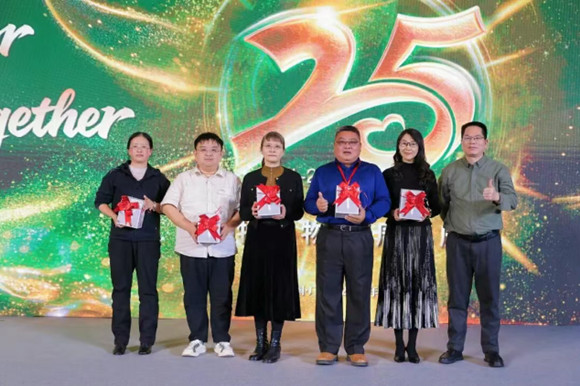 在晚宴致辭環(huán)節(jié),潔特生物董事長袁建華先生與總經(jīng)理Yuan Ye James再次明確了“成為全球生命科學(xué)領(lǐng)域領(lǐng)先的跨國企業(yè)"宏偉愿景,并向所有同行者致以最崇高的敬意。隨后,兩位領(lǐng)導(dǎo)為陪伴企業(yè)奮斗十五乃至二十余年的老員工頒發(fā)“匠心堅(jiān)守功勛獎(jiǎng)",以表彰他們長期以來的奉獻(xiàn)與堅(jiān)守。在緊接著舉行的慶生儀式上,袁建華先生與大家舉杯祝酒,將“匠心同守,榮耀共慶"的氛圍推向高潮。