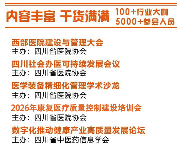 展會期間將舉辦超過20場專業(yè)會議與論壇,系列會議由四川省醫(yī)院協(xié)會、四川省中醫(yī)藥信息學會、四川省保健協(xié)會等權威機構共同主辦,內(nèi)容兼具高度與實踐深度。