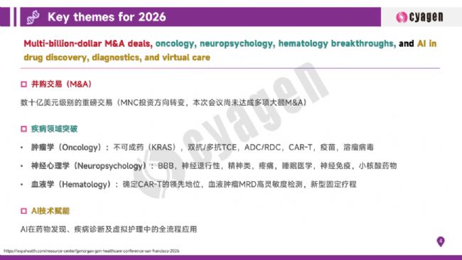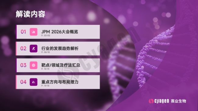 賽業(yè)生物特此準備了一份JPM 2026解讀報告,請下載JPM Healthcare Conference 2026 深度解讀,從數(shù)百家參會機構中,嚴選了109家具有行業(yè)顛覆性的核心藥企進行系統(tǒng)性分析,旨在通過這些核心樣本穿透資本迷霧,為醫(yī)藥行業(yè)定調(diào)全年的投資邏輯與研發(fā)新坐標。相關解讀內(nèi)容節(jié)選如下。