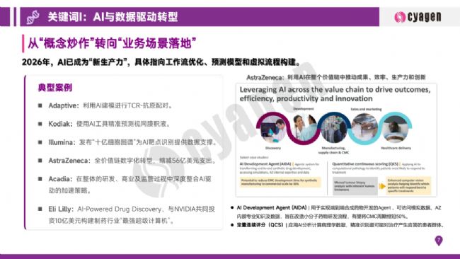AI已正式進入業(yè)務場景。阿斯利康利用AI Agent (AIDA) 系統(tǒng)有望將CMC周期縮短50%。禮來則與NVIDIA共同投資10億美元構建制藥行業(yè)最強超級計算機。Illumina的“十億細胞圖譜”為AI靶點識別提供了底層數(shù)據(jù)支撐。