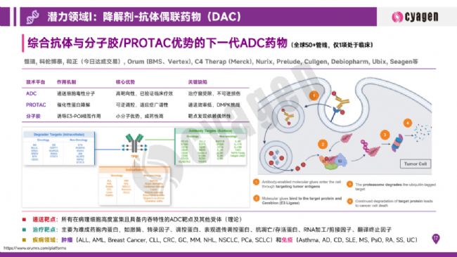 潛力新星DAC正在崛起。它完美融合了ADC的精準導向與降解劑的催化高效。全球50+項管線中,恒瑞、科倫博泰等中國企業(yè)表現(xiàn)搶眼。其優(yōu)勢在于能靶向難成藥的胞內(nèi)蛋白,并顯著克服傳統(tǒng)ADC的耐藥性。
