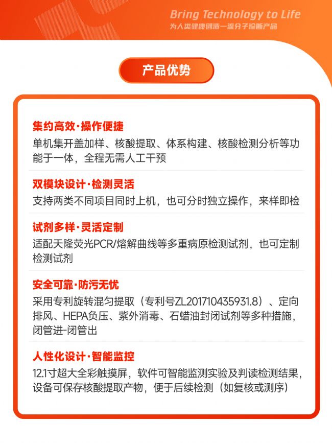 - 安全可靠 防污無憂:采用專利旋轉(zhuǎn)混勻提取(專利號ZL201710435931.8)、定向排風(fēng)、HEPA負(fù)壓、紫外消毒、石蠟油封閉試劑等多種措施,閉管進(jìn)-閉管出
