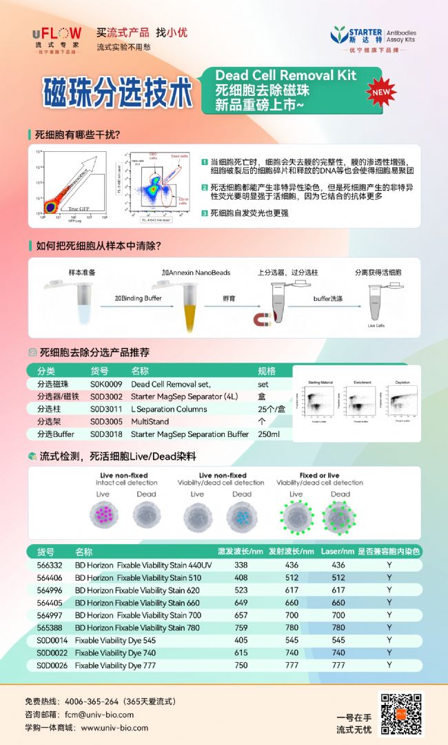 優(yōu)寧維始終以 “流式實驗不用愁” 為理念,通過 STARTER 和 UFLOW 兩大品牌,持續(xù)為科研工作者提供高品質(zhì)的流式產(chǎn)品和專業(yè)的技術(shù)支持,F(xiàn)在,死細胞去除磁珠已重磅上市,歡迎前往優(yōu)寧維學購一體商城(www.univ-bio.com)或撥打免費熱線 4006-365-264 咨詢,讓每一次實驗都更有底氣。