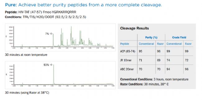 加熱可加速去除所有保護基團,即使是堅固的保護基團也不在話下。憑借Razor,您就不必再懷疑肽中的Pbf是否全部脫落……它絕對會脫落。溫度升高會促進分子運動,使裂解試劑和清除試劑能夠進入長肽的疏水區(qū)和空間位阻部分。這樣就可以優(yōu)化自動多肽合成后的工作流程——特別是在使用快速自動微波多肽合成器時。
