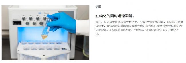 高溫環(huán)境下,可并行切割至多 12 條多肽,僅需 2 分鐘即可完成微量多肽切割,為昂貴氨基酸的偶聯(lián)效果及放大合成的偶聯(lián)完整性驗證提供質(zhì)譜級別的精準數(shù)據(jù)支撐。全量多肽切割 30 分鐘內(nèi)即可完成,大幅加速實驗室的多肽純化流程,以業(yè)內(nèi)領先的速度獲得純化多肽產(chǎn)物。