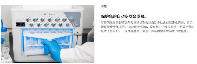 即便面對強腐蝕性切割試劑與清除劑,儀器仍可實現(xiàn)全天候不間斷運行。Razor 采用簡約化設計,無復雜閥組結構,無需專業(yè)技術人員進行高額成本的維護操作;搭配一次性反應容器,不僅讓實驗后清洗更便捷,更能有效保障多肽產(chǎn)物的純度不受污染。