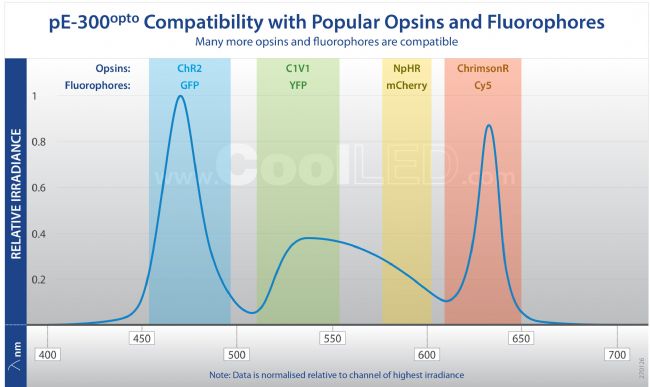 配備三個強大可獨立控制的 LED – 藍色 (470 nm)、綠黃色 (550 nm) 和紅色 (635 nm) – 每個都可以通過內(nèi)置激發(fā)濾光片進行優(yōu)化,以匹配最廣泛使用的視蛋白。