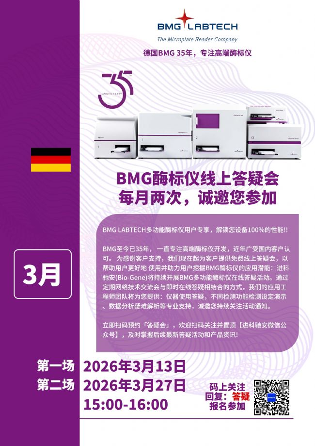 二十三場BMG多功能酶標儀答疑會繼續(xù)如約而至,就在3月13號,本周五下午15:00開始,一個小時的互動交流,答疑解惑,快來掃碼預約呀,期待您的到來~