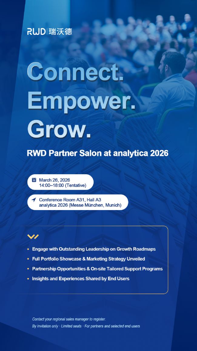 本屆 Analytica 期間,瑞沃德還將特別舉辦一場合作伙伴沙龍(RWD Partner Salon)。沙龍以“Connect. Empower. Grow.”為主題,我們希望通過更近距離的對(duì)話,與來自不同市場的合作伙伴深入交流發(fā)展經(jīng)驗(yàn)與合作構(gòu)想,共同探討未來增長路徑與合作機(jī)遇。