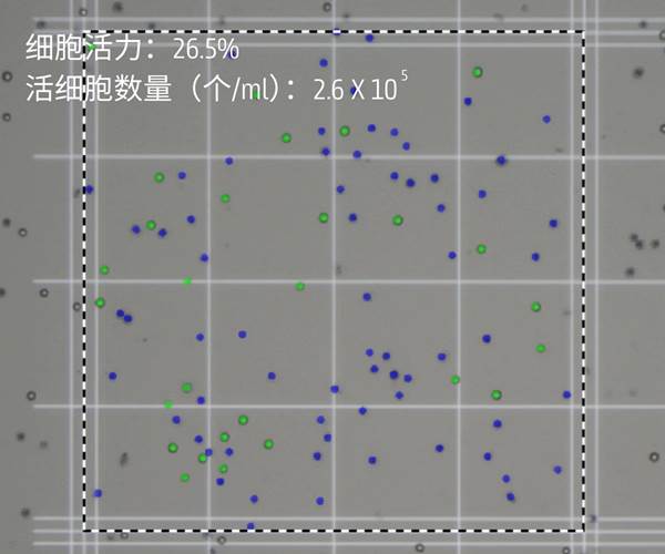 ▲HeLa細(xì)胞,基于非一次性血球計(jì)數(shù)板的細(xì)胞計(jì)數(shù)和死活比例測定(臺(tái)盼藍(lán)染色,綠色為活細(xì)胞,藍(lán)色為死細(xì)胞)