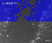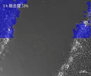 ▲HeLa細(xì)胞劃痕實(shí)驗(yàn),相差成像,藍(lán)色:細(xì)胞融合度分析示意圖