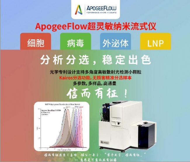 進(jìn)科馳安(Bio-Gene)作為英國ApogeeFlow在中國的全國總代理商,其主打產(chǎn)品ApogeeFlow超靈敏納米流式儀在過往的行業(yè)活動中備受關(guān)注。本次展會,進(jìn)科馳安將攜手ApogeeFlow共同參加并贊助此次展會。將在本次展會中展出公司主打產(chǎn)品“ApogeeFlow超靈敏納米流式儀”,并且有專門的銷售和技術(shù)人員為大家演示操作,答疑解惑。屆時進(jìn)科馳安將在23號展位期待您的光臨!