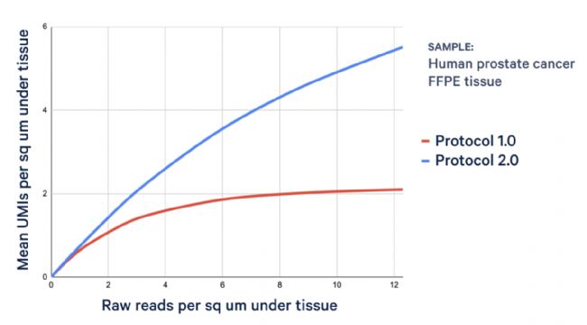 下圖展示了使用Protocol 1.0(6.5 mm芯片)與Protocol 2.0(6.5 mm及11 mm芯片)對連續(xù)切片進行分析的實測數(shù)據(jù),靈敏度的提升一目了然: