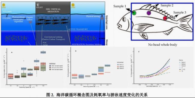 2)與電子傳遞系統(tǒng)活性隨游泳速度的變化,試驗(yàn)結(jié)果表明:金頭鯛耗氧率隨游泳速度呈四參數(shù)S型曲線增長(zhǎng);而ETS活性不受短期游泳活動(dòng)影響,可作為最大有氧能力的穩(wěn)定proxy;其R/ETS比值為0.17–0.71,靜止態(tài)取低值、活躍態(tài)取高值,可優(yōu)化碳通量模型,為中深層魚(yú)類晝夜垂直遷移的呼吸通量與生物碳泵估算提供方法依據(jù)。