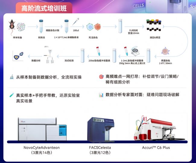 從樣本制備到數(shù)據(jù)分析全流程實(shí)操,配備 NovoCyteAdvanteon(3 激光 14 色)、FACSCelesta(3 激光 12 色)、Accuri™ C6 Plus 多款主流設(shè)備。手把手教學(xué)還原真實(shí)實(shí)驗(yàn)室場(chǎng)景,覆蓋補(bǔ)償調(diào)節(jié)、設(shè)門(mén)策略、稀有細(xì)胞分析等高頻難點(diǎn),數(shù)據(jù)分析專(zhuān)家現(xiàn)場(chǎng)破解疑難問(wèn)題。