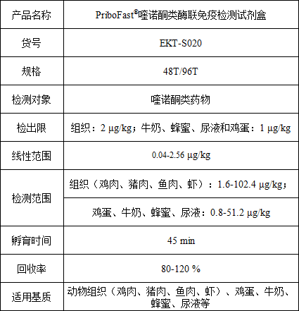 近日,青島普瑞邦生物工程有限公司推出PriboFast®喹諾酮類酶聯(lián)免疫檢測試劑盒,利用間接競爭 ELISA 方法,檢出限為1.0-2.0 μg/kg,可對(duì)動(dòng)物組織、雞蛋、牛奶、蜂蜜等食品中的喹諾酮藥物定量檢測。