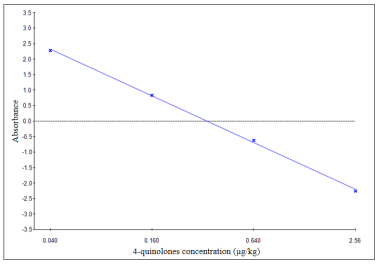喹諾酮類藥物線性范圍為0.04-2.56 μg/kg,吸光值與其含喹諾酮類藥物濃度呈負(fù)相關(guān)。將酶標(biāo)儀450 nm下測量的吸光值導(dǎo)入本公司提供的專業(yè)數(shù)據(jù)分析軟件中便可輕松完成數(shù)據(jù)分析。