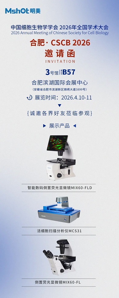 4 月10-11日,合肥濱湖國際會展中心3號館B57展位,明美光電期待與您相遇!我們將安排專業(yè)技術(shù)團隊現(xiàn)場演示產(chǎn)品功能、解答技術(shù)疑問,同步提供定制化顯微成像方案咨詢。誠邀您蒞臨展位,共話細胞生物學發(fā)展新機遇,見證國產(chǎn)顯微技術(shù)的創(chuàng)新實力!