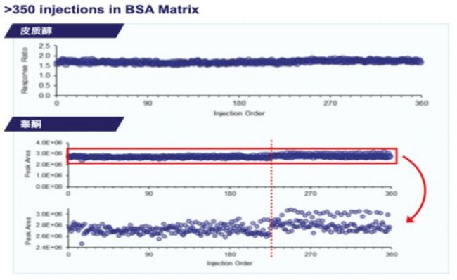 圖1. 350針BSA基質樣品分析后類固醇的峰面積穩(wěn)定性