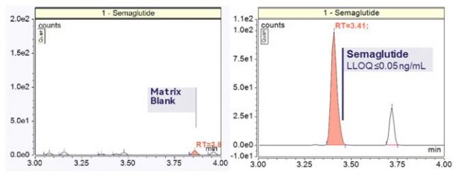 隨著生物制藥項目對高選擇性、高靈敏度定量方法在藥代動力學(PK)和生物標志物研究中的需求不斷增加,對GLP-1肽和寡核苷酸治療藥物的定量需求也日益增長。GLP-1肽及其類似物由于分子大小、不穩(wěn)定性以及內源性基質干擾,給分析帶來了嚴峻的挑戰(zhàn)。使用TSQ Certis對司美格魯肽和利拉魯肽進行檢測,結果表明,可以實現(xiàn)對GLP-1肽的極高靈敏度和特異性定量分析——檢測限低至0.05 ng/mL。