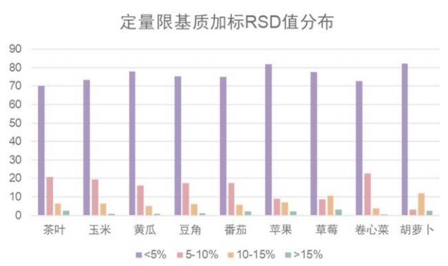 中性粒子檔桿等硬件設(shè)計降低系統(tǒng)背景噪音,提高系統(tǒng)穩(wěn)定性,減少污染積累,延長清洗維護周期,提高批量樣品運行一致性。食品樣品基質(zhì)差異顯著,在復(fù)雜基質(zhì)條件下的定量限加標穩(wěn)定性表現(xiàn)優(yōu)異,選取蔬菜、水果、茶葉和谷物4類基質(zhì)9種基質(zhì)進行實測。